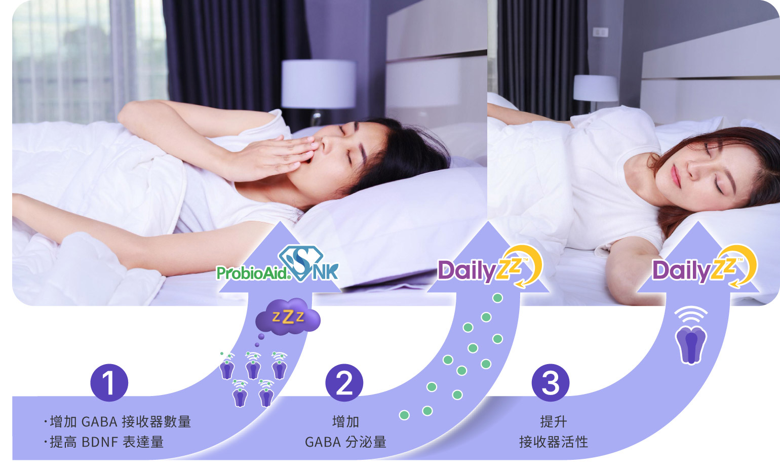 速益眠 TribioGABA® 倍乘™ 配方透過 ProbioAid® SNK 和 DailyZz™ 的協同作用,進一步提升 GABA 的作用,讓睡眠訊號強化,更快入睡並保持高品質的深層睡眠。